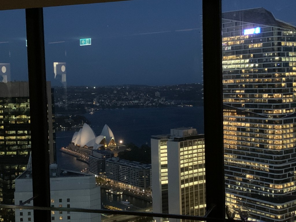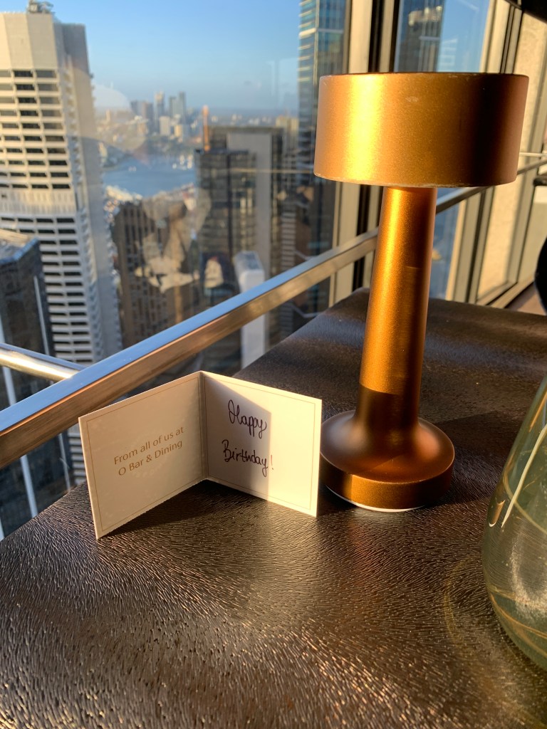 For dinner we had reservations in the O Bar & Dining revolving restaurant, on the 47th floor of Australia Square. Because it was my birthday we received a free glass of bubbles each when we arrived plus they gave me a really lovely birthday card and exquisite dessert.